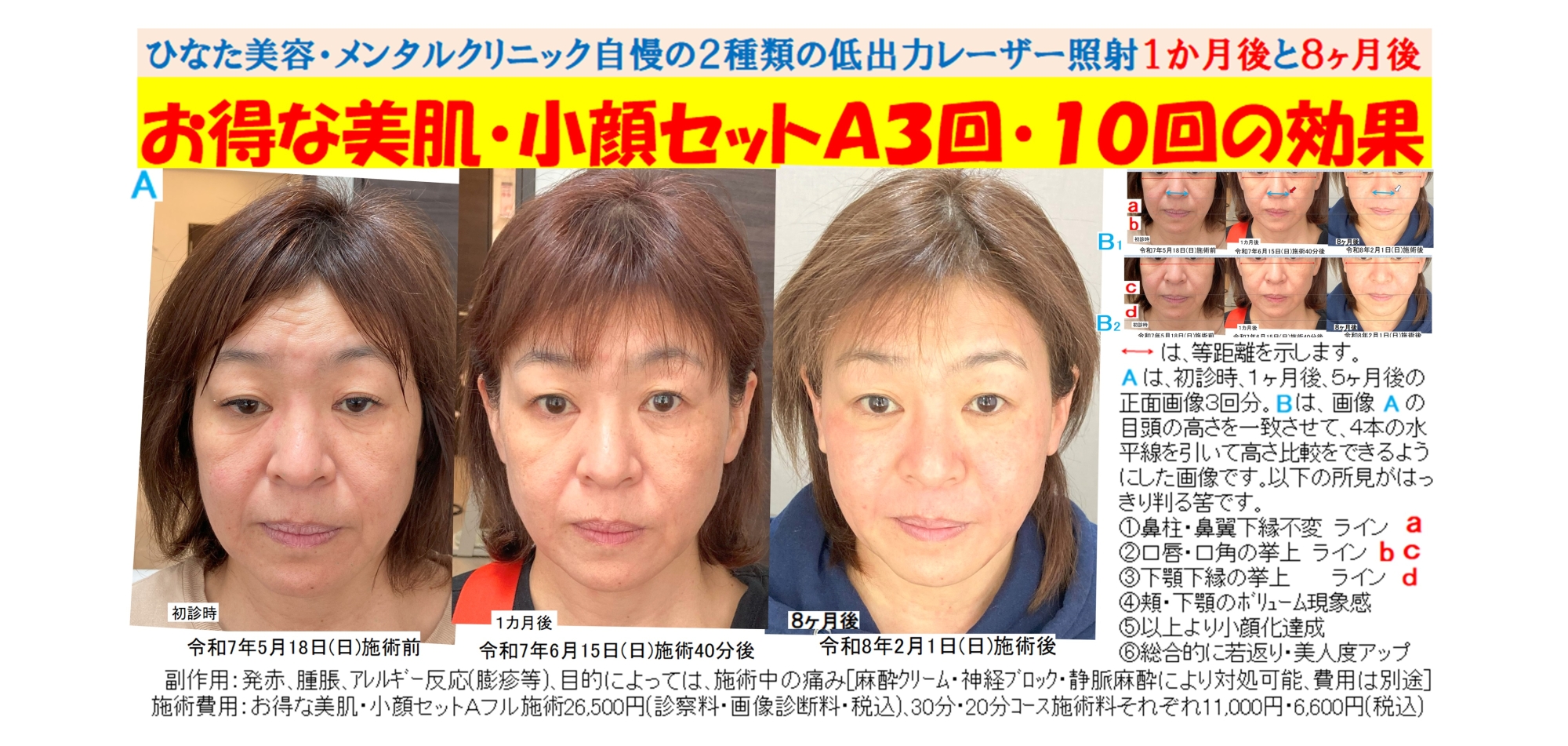 2025年6月までのキャンペーンは、医療広告ガイドラインのために提供できなくなっています。従来のお得な美肌・小顔セットA10,000~12,000円に最も近い施術は、お得な美肌・小顔セットA30分コースです。