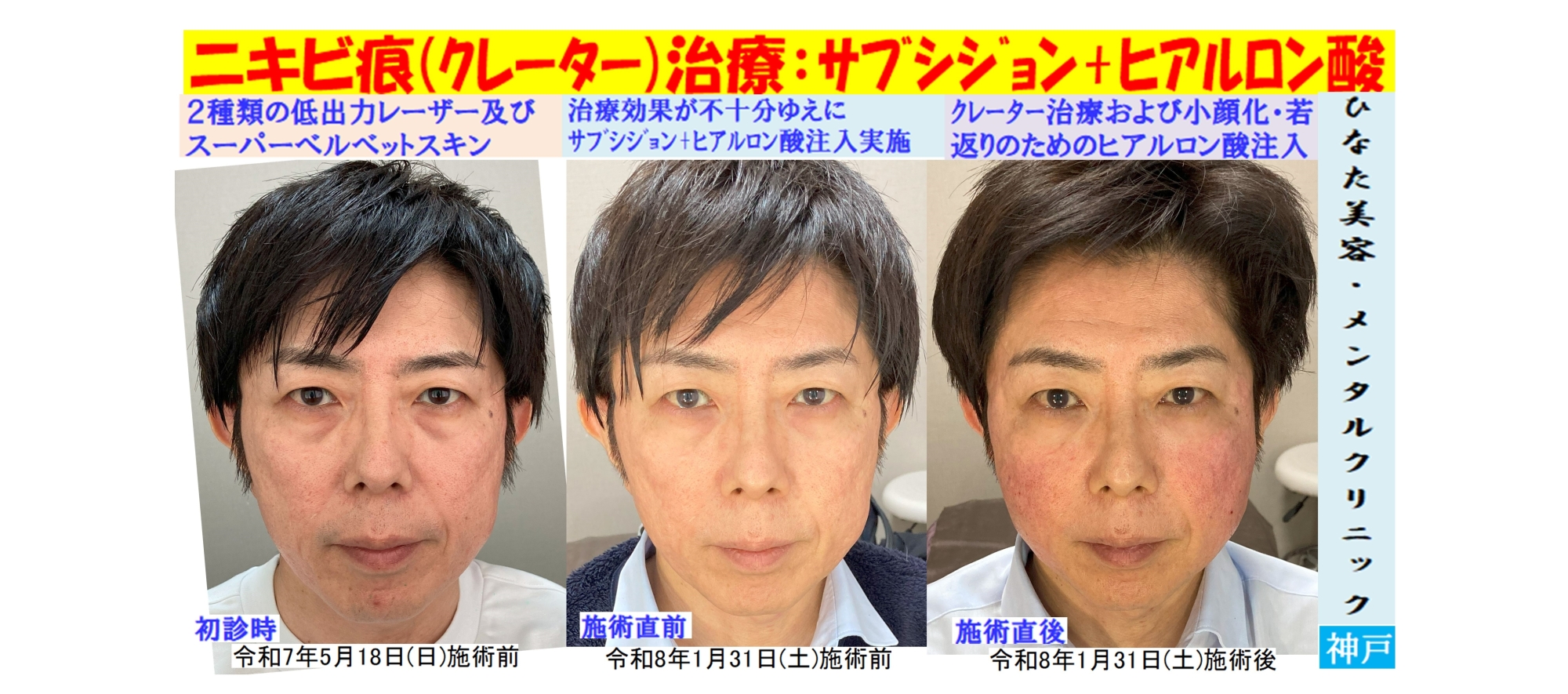 ニキビ痕治療に対する治療【サブシジョン】を開始しました。クレーターの下の結合組織を切断する治療です。サブシジョン後にヒアルロン酸を注入するとなお効果的です。(下の画像)