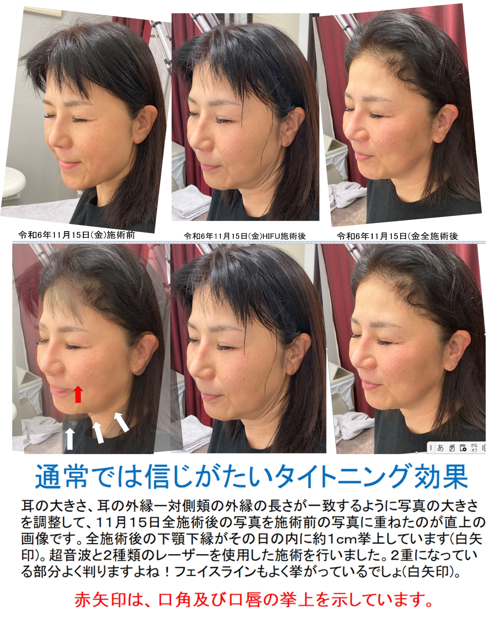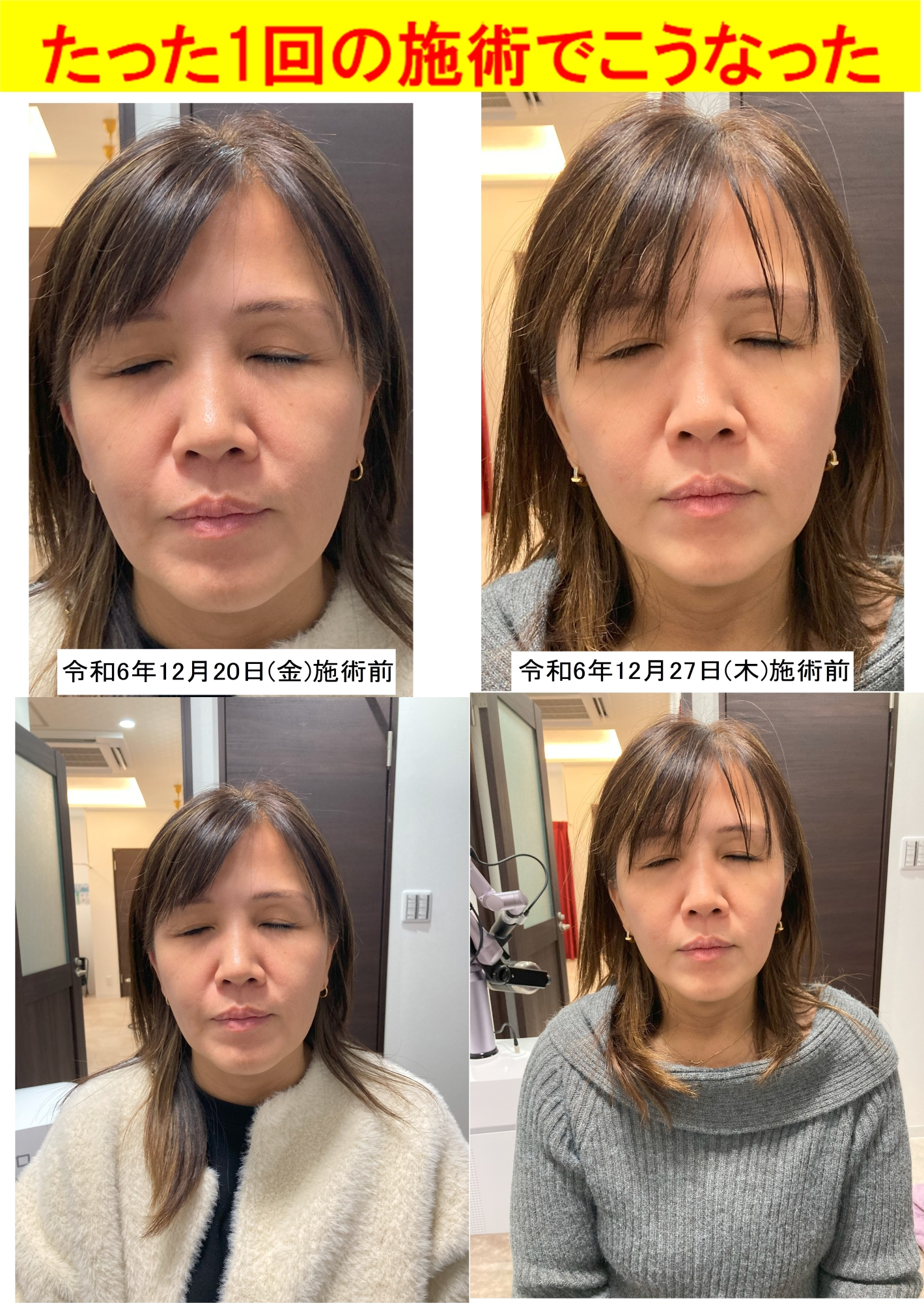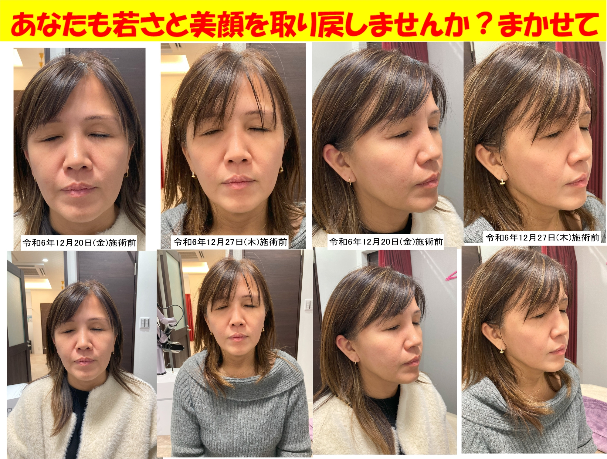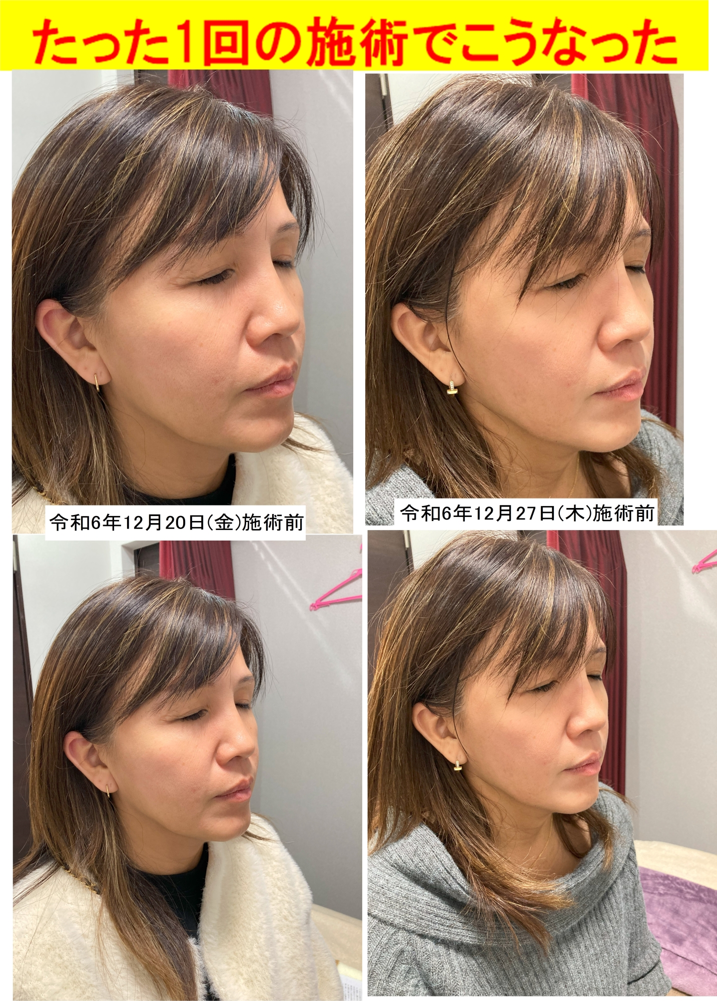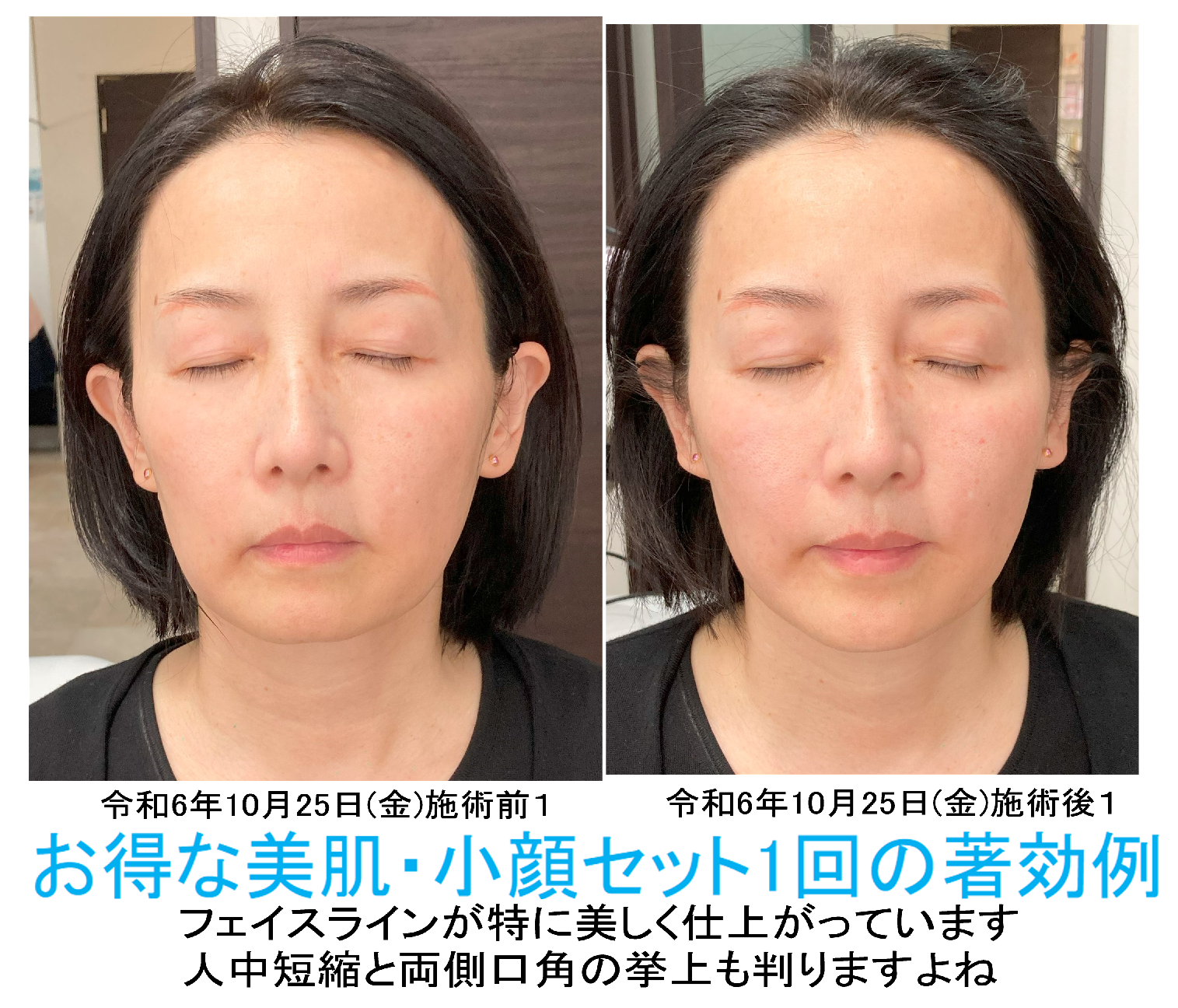 お得な美肌・小顔スペシャルセットA先日は令和6年11月15日(金)、本日は令和6年12月7日(日)とても施術が著効した患者さんが来られたので皆さんにご覧いただきます。