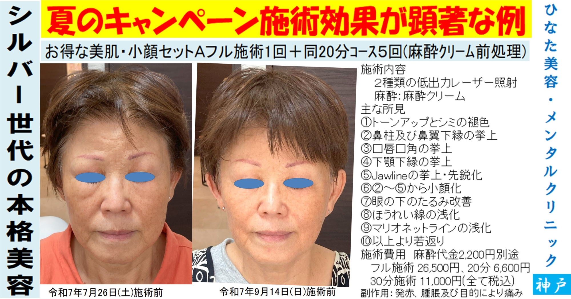 古稀を過ぎた患者様。お得な美肌・小顔セットAフル施術を7月に1回、その後毎週のように