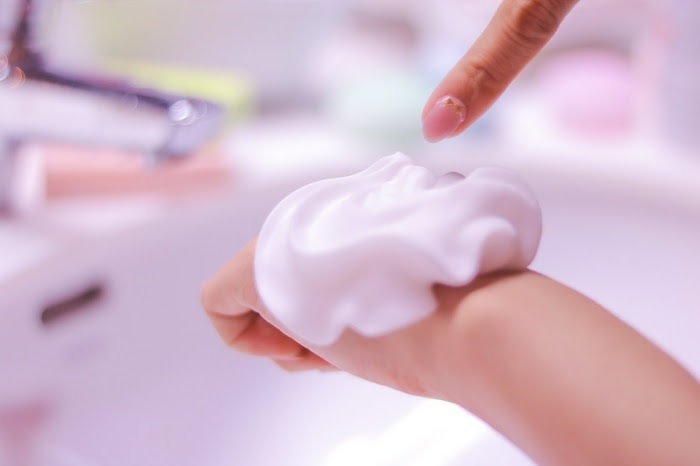 ・洗顔は肌に残ったクレンジング剤や古い角質を落とすステップです。きめ細かい泡を作り、皮脂分泌の盛んな鼻や額に先に泡を乗せて、こすらないように洗いましょう。洗い終わったらタオルでそっと水分を拭き取ってください。